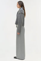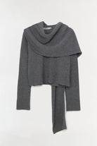 A cropped wool cashmere blend sweater with long sleeves, wide banded hems, and a wraparound scarf detail at the neck.