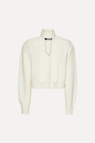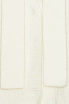 KNIT SCARF CARDIGAN WHITE IS A CROPPED CARDIGAN WITH SLIGHTLY DROPPED SHOULDERS AND LONG SLEEVES. IT FEATURES A RIBBED HEM, CUFFS, AND NECKLINE, AND IS DETAILED WITH A BUILT-IN SCARF ATTACHED AT THE COLLAR THAT DRAPES DOWN THE FRONT AND BACK. THE CARDIGAN IS MADE FROM A SOFT AND FLUFFY WOOL AND ALPACA BLEND.