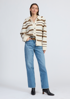 This Peggy Striped Oversized Cardi offers cozy warmth and a relaxed fit, perfect for layering over your favorite denim. Its soft wool blend keeps you comfortable throughout the day, while the timeless stripes add subtle style. Ideal for dressing up or down, this cardigan supports effortless, everyday wear with a touch of classic charm.