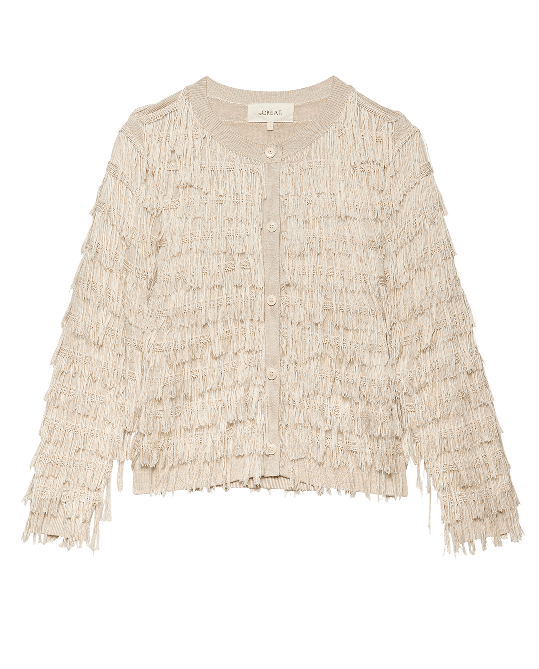 A shrunken silhouette inspired by 1920s texture play, The Fringe Cardigan features soft ribbing at the collar, cuffs, and hem, and is adorned with delicate looped fringe across the body. Finished with a button placket and spun from soft viscose yarn for lightness and ease.