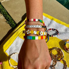 The Teacher Gold Line Bracelet features textured gold beads in a thinner size with the word "TEACHER." A perfect gift for all the teachers that you love! Part of our stackable words collection, each bracelet is 7" in length, 7MM bead diameter and is a slip-on-style. All of our single bracelets are designed to be stacked or they can be styled to wear alone.