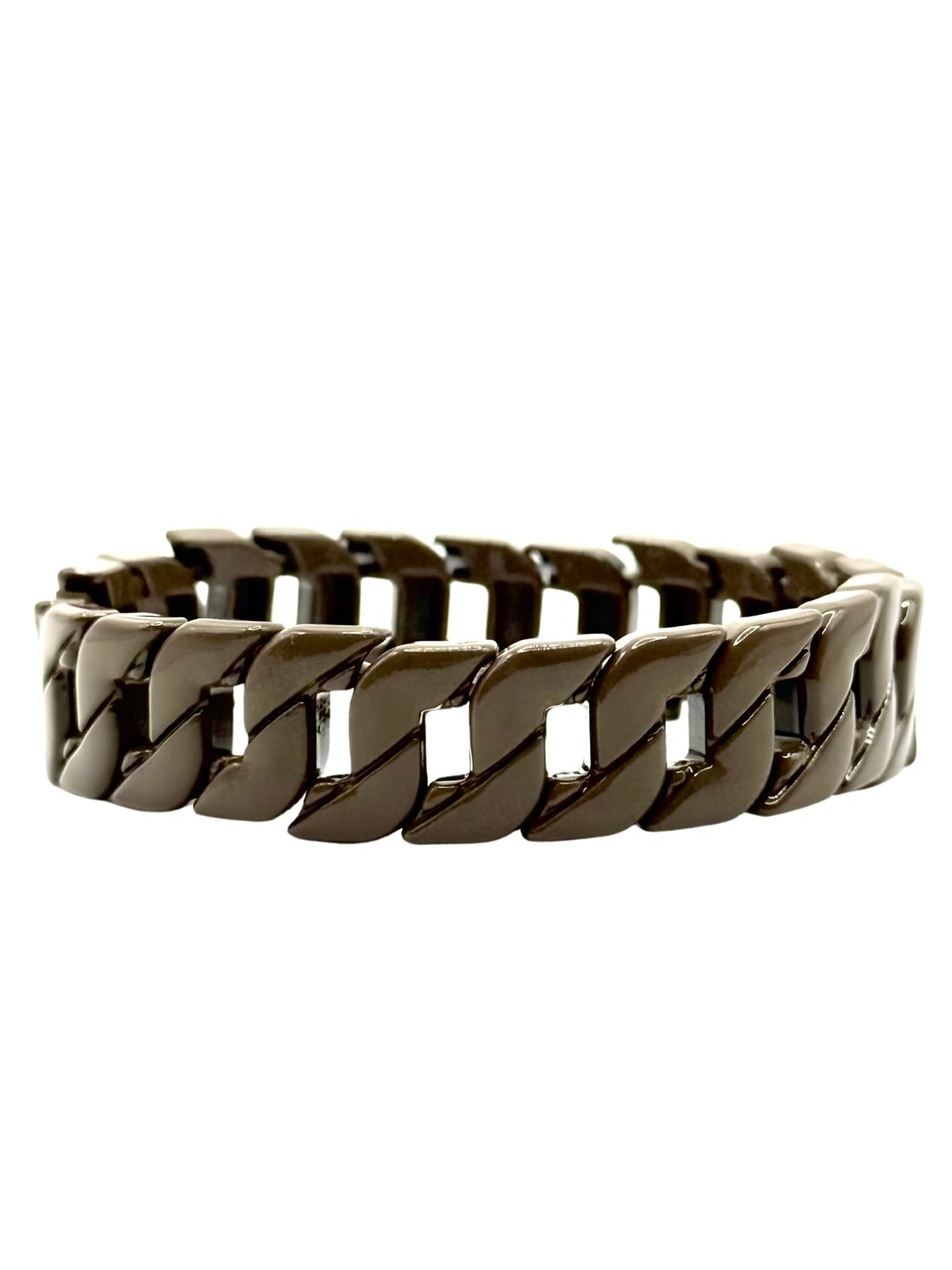 A large cuban chain, but with stretch! This bracelet is hand-crafted using mocha colored and gemstone enamel beads. We carefully select each color pallet to strike a style for both everyday and special occasions. This bracelet is 7" in length, 7MM bead diameter and is a slip-on-style. All of our single bracelets are designed to be stacked or they can be styled to wear alone.