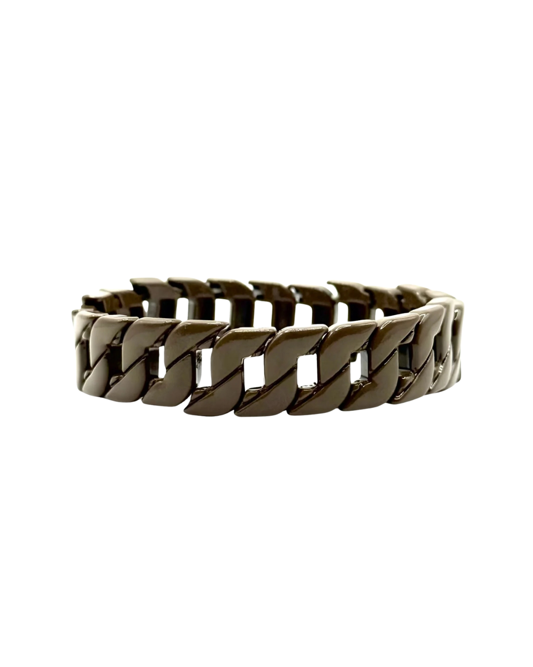 A large cuban chain, but with stretch! This bracelet is hand-crafted using mocha colored and gemstone enamel beads. We carefully select each color pallet to strike a style for both everyday and special occasions. This bracelet is 7" in length, 7MM bead diameter and is a slip-on-style. All of our single bracelets are designed to be stacked or they can be styled to wear alone.