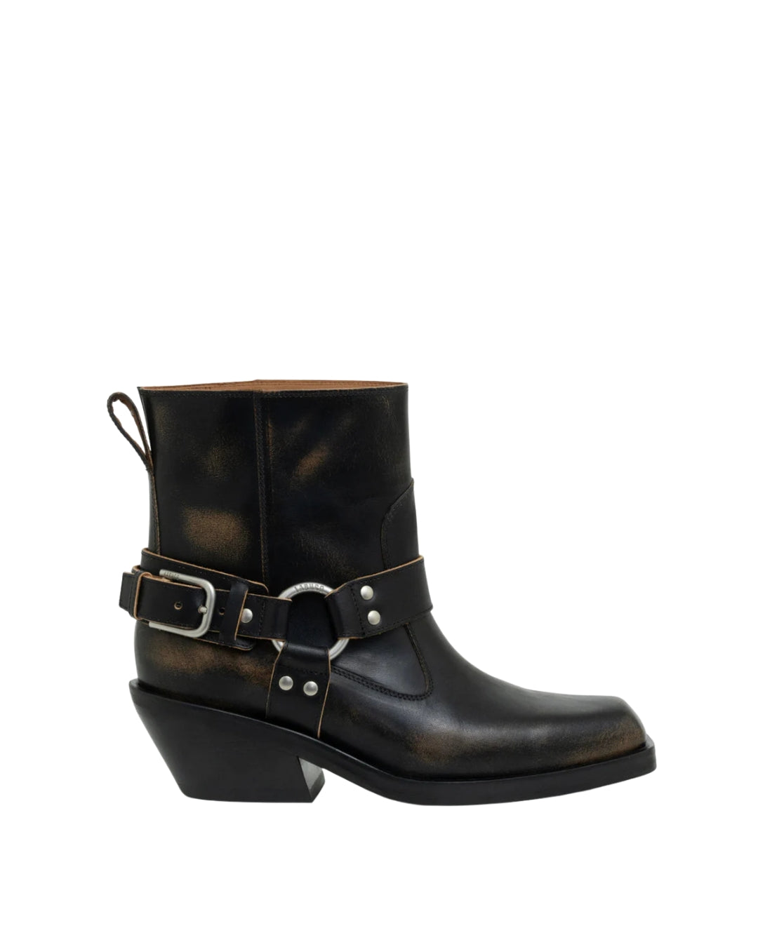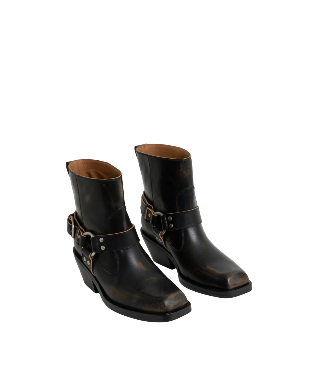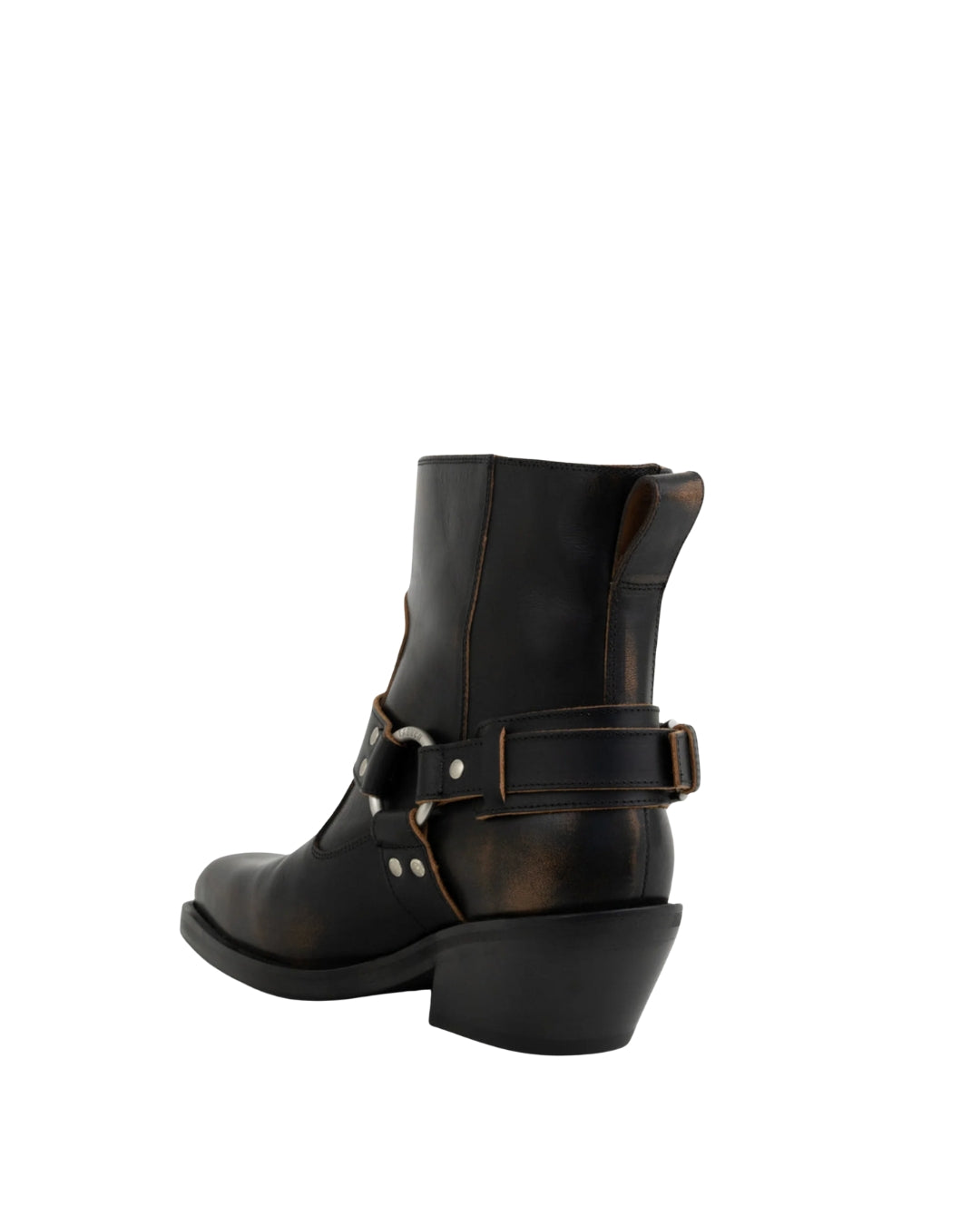 Labucq interpretation of a classic harness motorcycle boot. Super cool vegetable tanned vaccheta upper with natural buffed detailing and brushed nickel hardware for distinctive flair. 2" stacked leather heel provides a comfortable lift. You will look amazing in these with some jeans or in a dress.