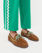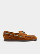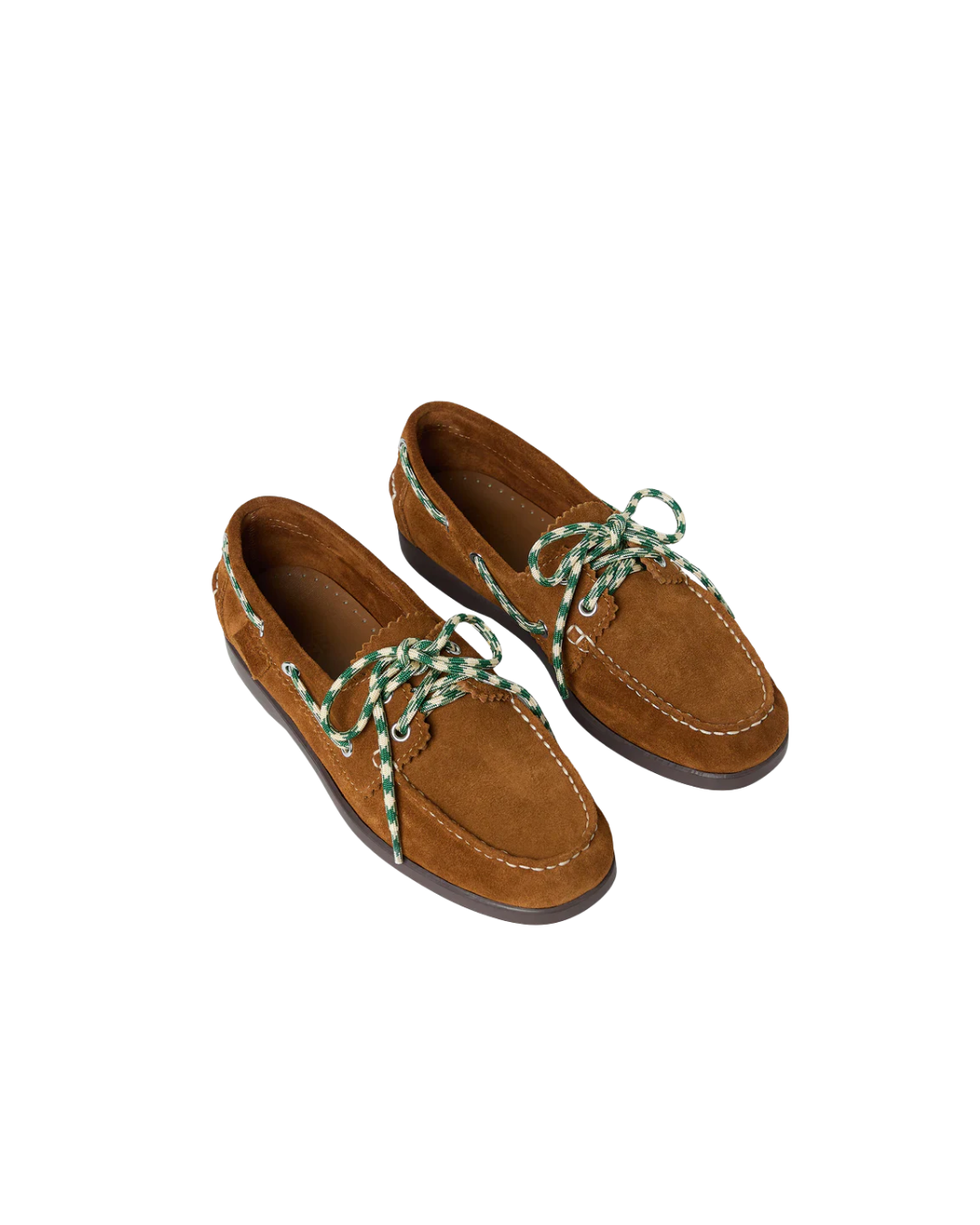 Boat shoe in cacao suede. Features custom green and cream cord laces, contrast stitching details, and a padded leather footbed with gold stamped logo.