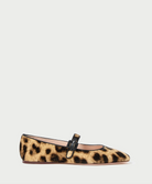 Mary Jane flat in leopard Italian velvet with delicate black piping. Features a padded leather footbed with gold stamped logo, a square toe, and an adjustable bridge strap with buckle closure.