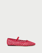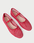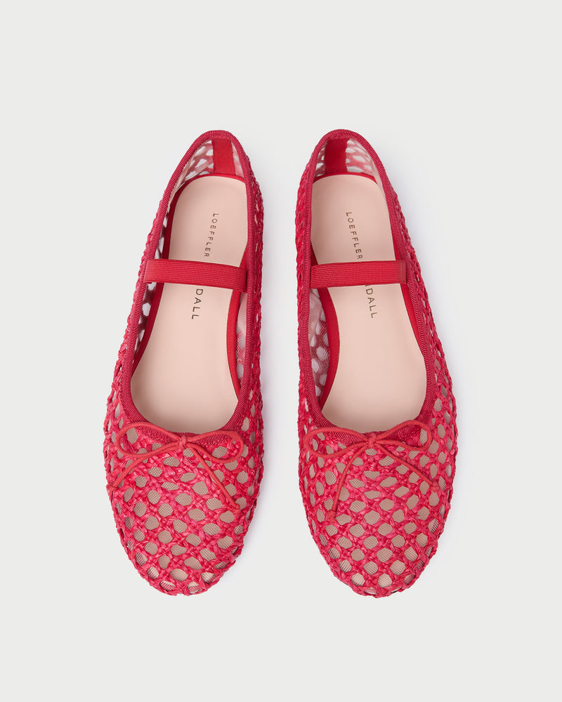 Soft ballet flat in red crocheted raffia with an elastic bridge strap and bow detail. Features a padded footbed with gold stamped logo and an almond toe.