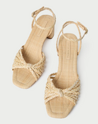 Knotted mid-heel sandal in natural straw. Features braided, pieced mignon straps, a tonal sole, an open toe, and an adjustable ankle strap. 2-inch heel.