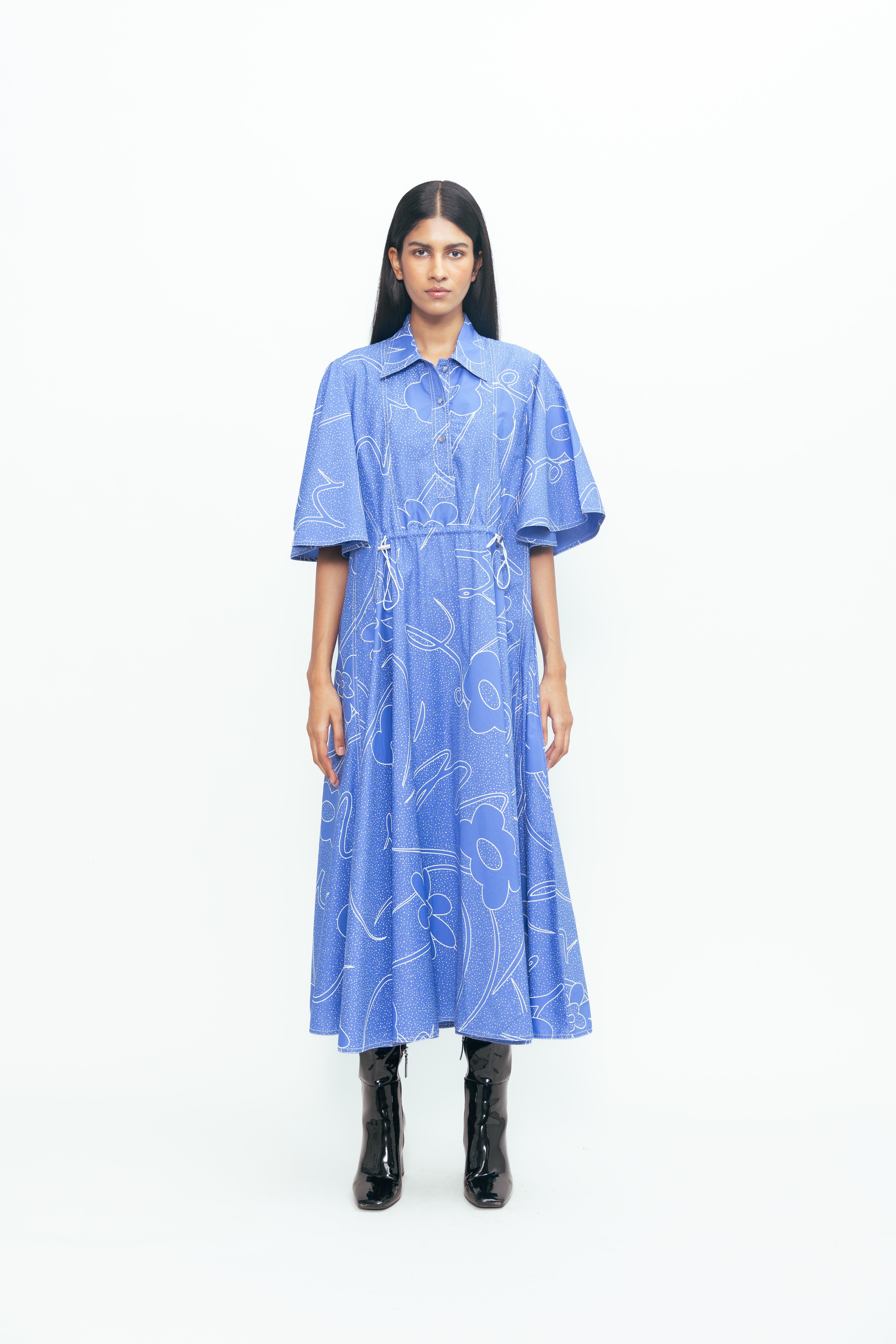 The Wanderstar Dress features a comfortable bungee drawstring waist for a customizable fit, stylish puff sleeves that add a touch of elegance, and a flattering midi length perfect for any occasion. Designed to support your confidence and style, this dress combines comfort with a chic silhouette you'll love to wear.
