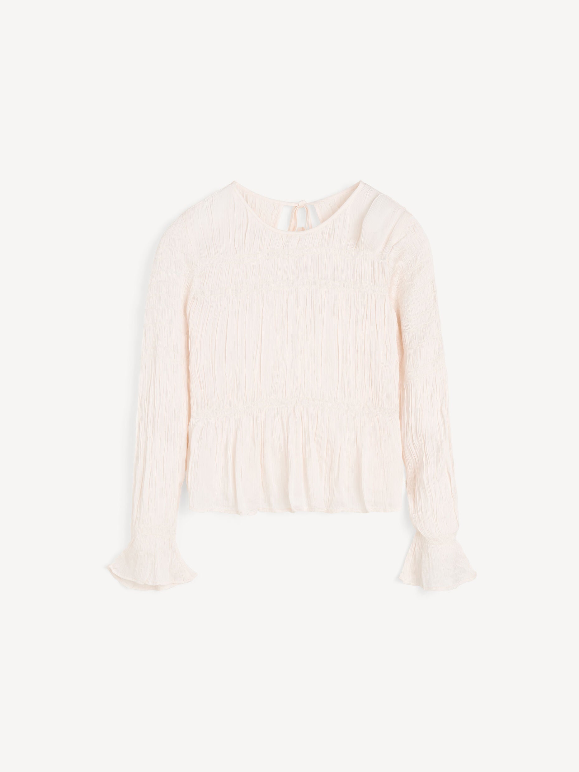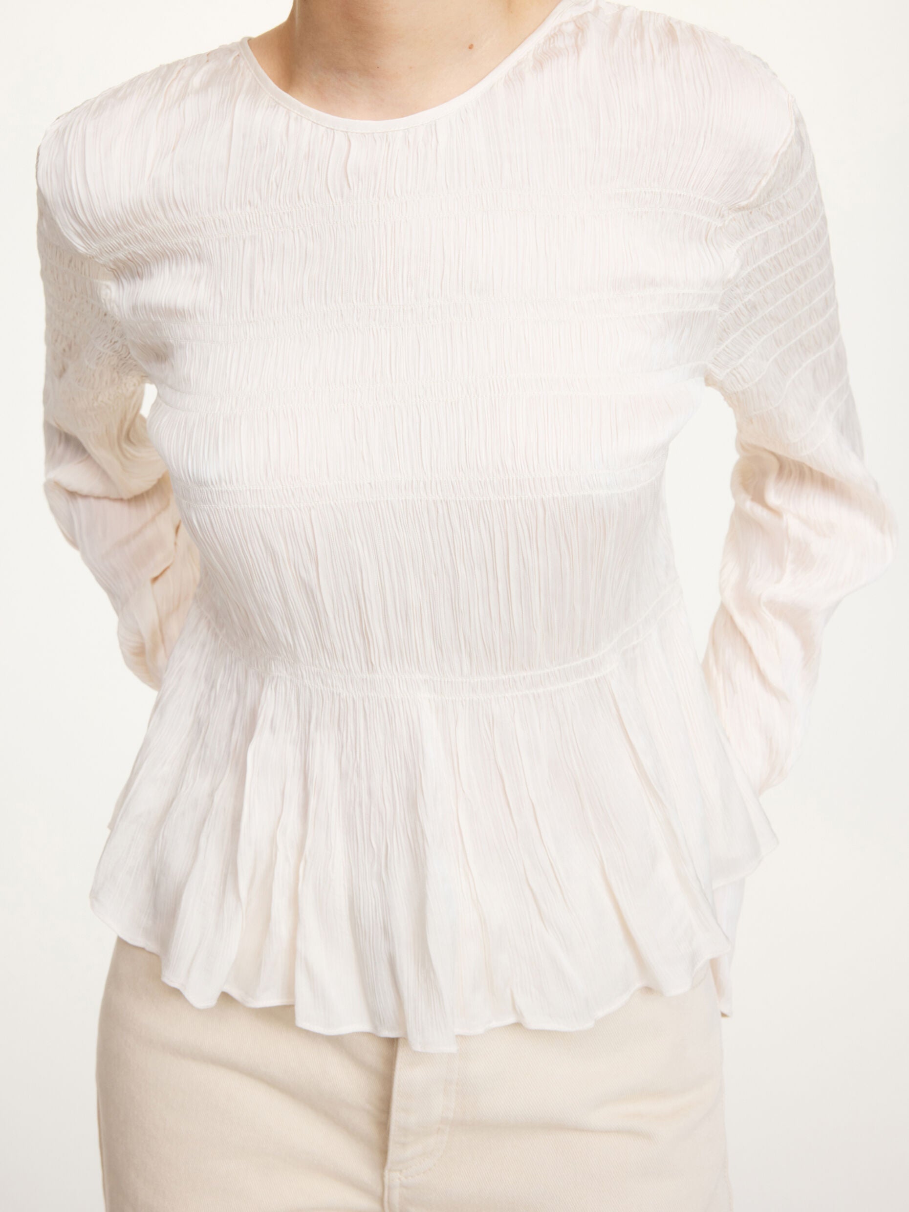 Making an eclectic assertion, the Ovas blouse is designed with smock details galore. The feminine fitted design – which features a low back with a tie closure – is ideal for special occasions.
