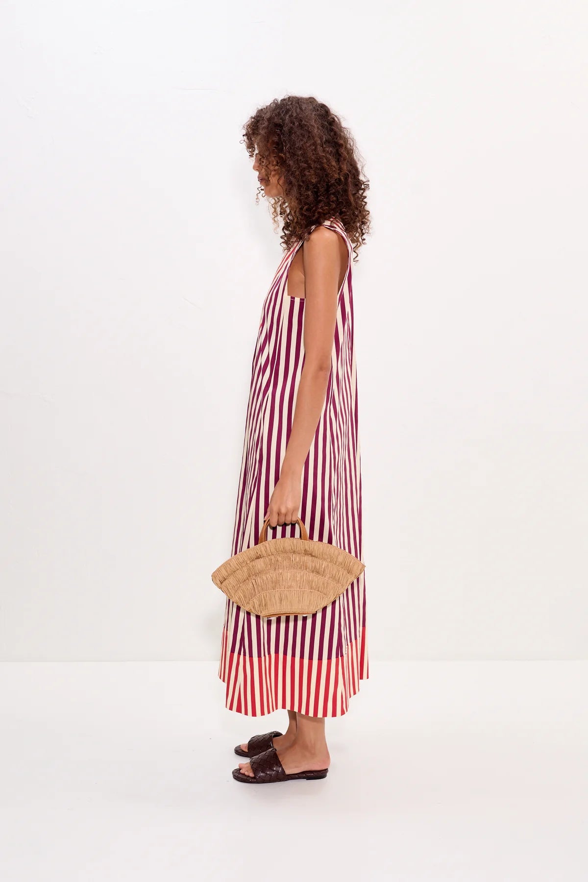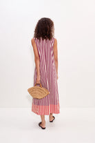 Sleeveless cotton poplin midi dress with an easy, relaxed fit. Finished with contrast stripe detailing at the neckline and hem for a subtle, elevated touch