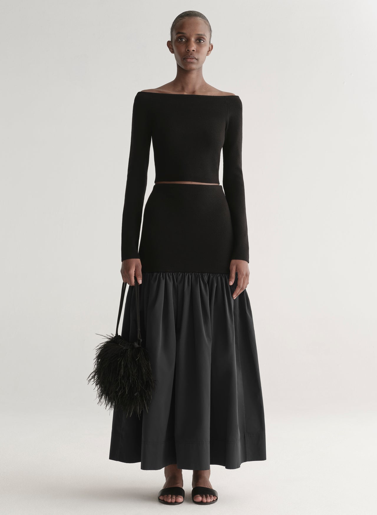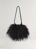 The Janie Bag is crafted from soft black ostrich feathers and detailed with smooth satin trim and adjustable satin strap handles that extend into a gathered, cinched opening. Its softly structured shape and featherlight volume bring a refined sense of whimsy to modern evening dressing.