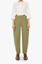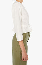 Greener pastures. A crewneck blouse with 3/4-length sleeves, a tied waist, buttons down the front and a slightly cropped fit. Made from 100% cotton in white, Where The Wildflowers Grow features delicate stitched details and faux-shell buttons.
