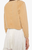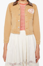 No pain no grain. A workwear-inspired jacket with drop shoulders, oversized patch pockets, buttons down the front and a cropped fit. Made from semi-rigid cotton, Whole Wheat is a faded khaki with a faux-leather collar and a patch on the chest.