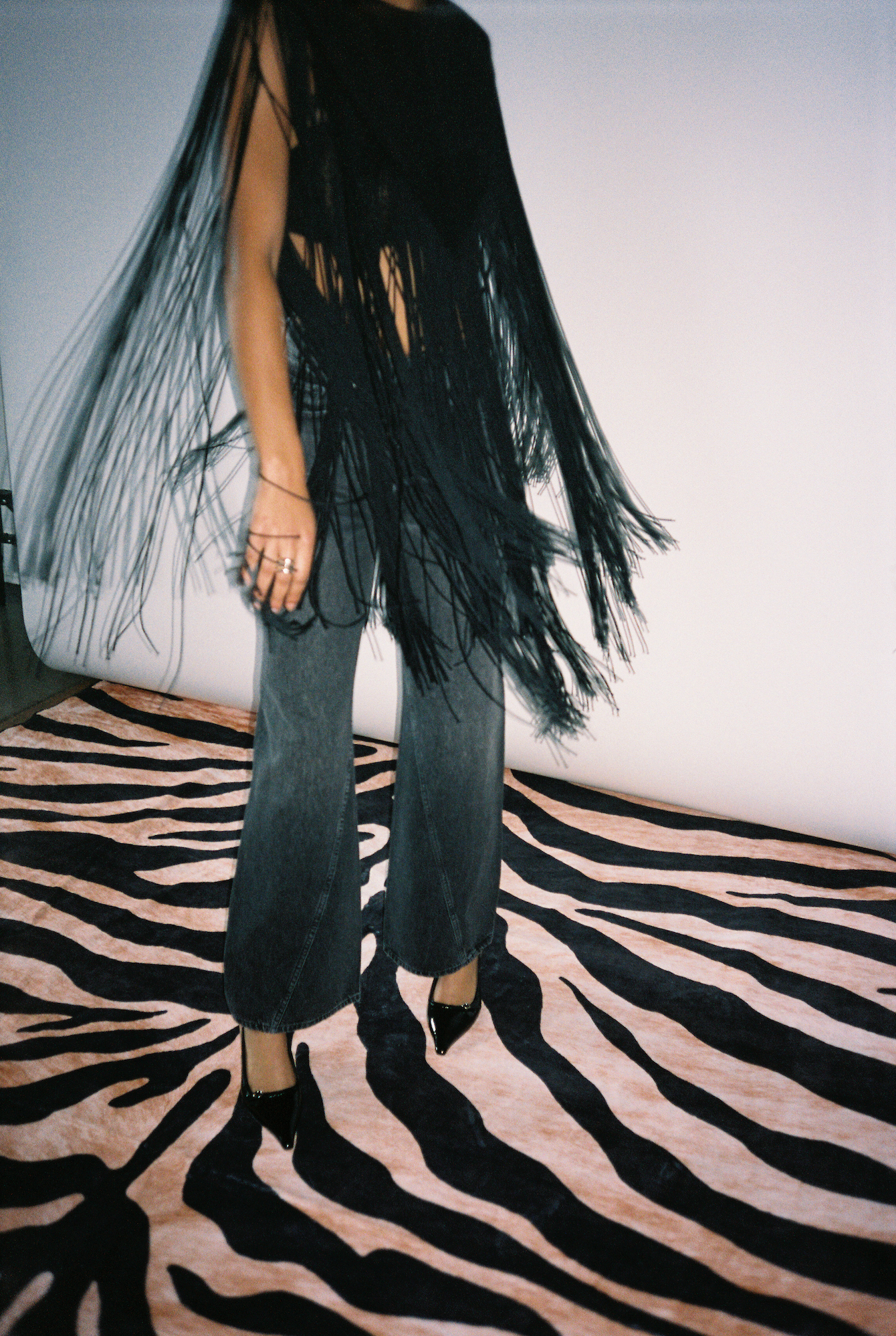 A cape that defines Creative Pragmatism. Cut from sustainably produced 4 ply silk, this piece features asymmetrical fringe detailing and a back zipper closure. Equal parts bold and pragmatic, it is the solution for last minute event dressing. Slip it over the Recycled Tropical Wool Corset Trouser to move seamlessly from desk to dinner to party.