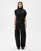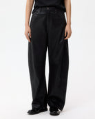 Mid-rise barrel pants in non-stretch, coated black denim, manufactured in LA. This jean is relaxed through the hip and leg and has darts at the knee. Complete with a five pocket style, detailed with nail head rivets, belt loops, zip fly and metal shank at the waistband.