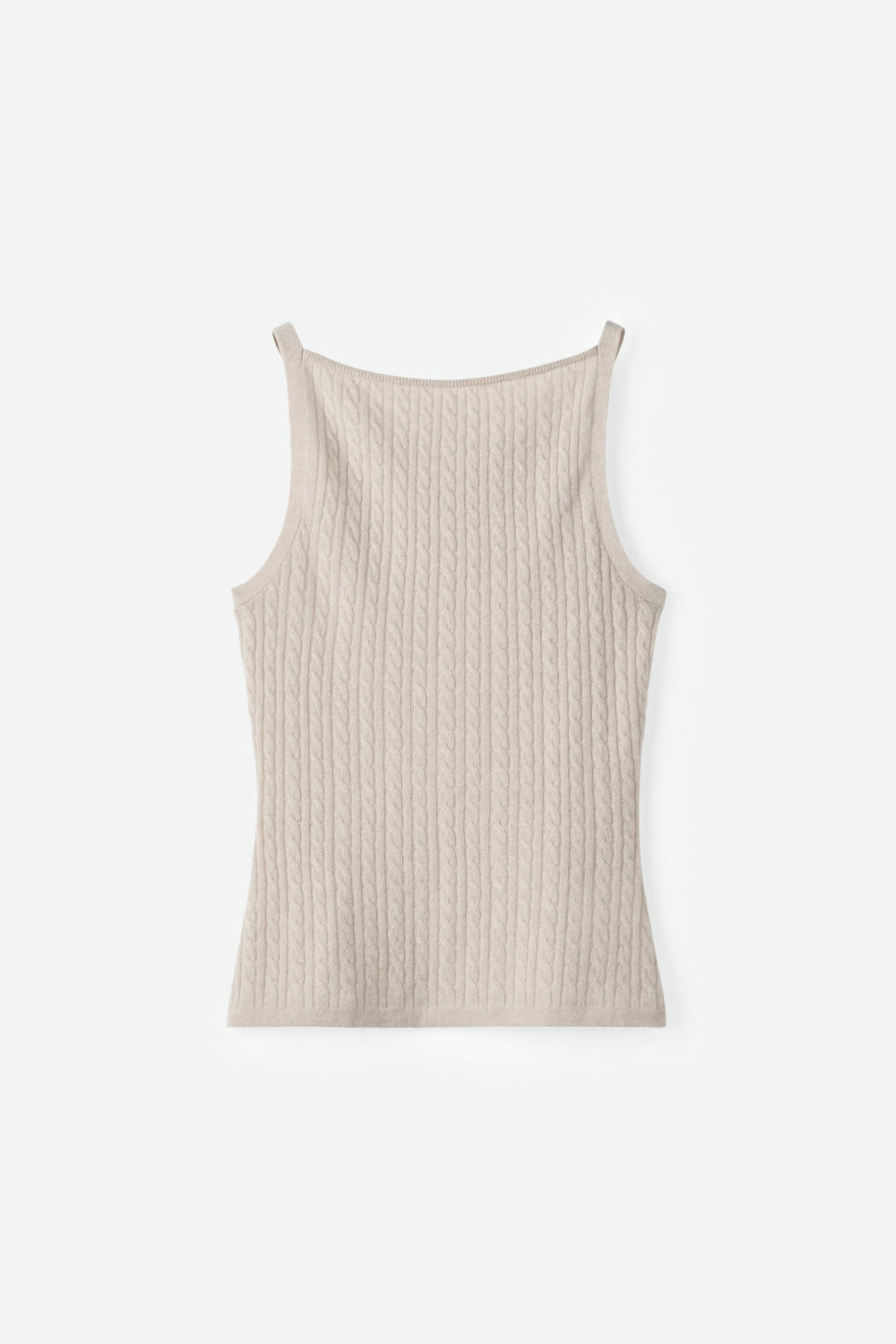 Cable knitted singlet with high straight neckline in 100% cashmere.