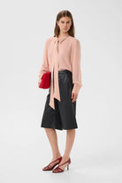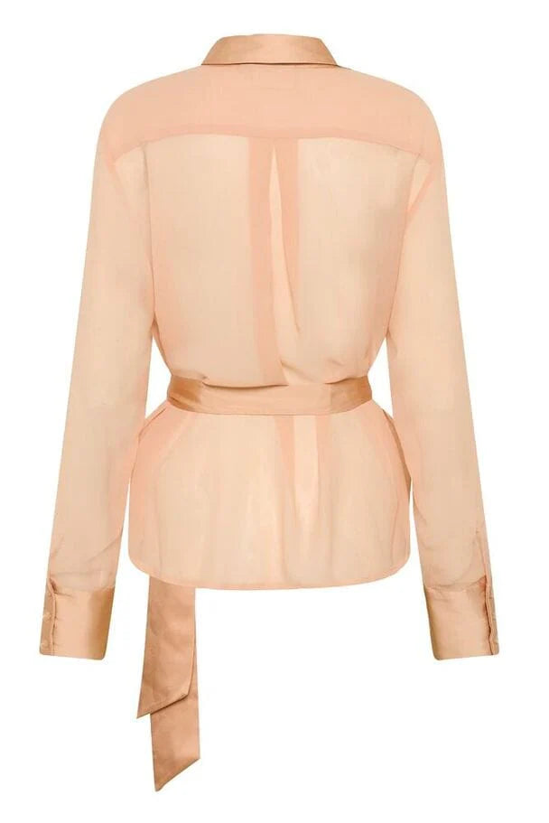 This sheer blouse with long sleeves and a classic shirt collar delivers a relaxed fit with a waist tie for adjustable styling. Designed for both comfort and versatility, it features wide cuffs and soft, lightweight fabric. Scarf is optional / can be worn separately.