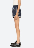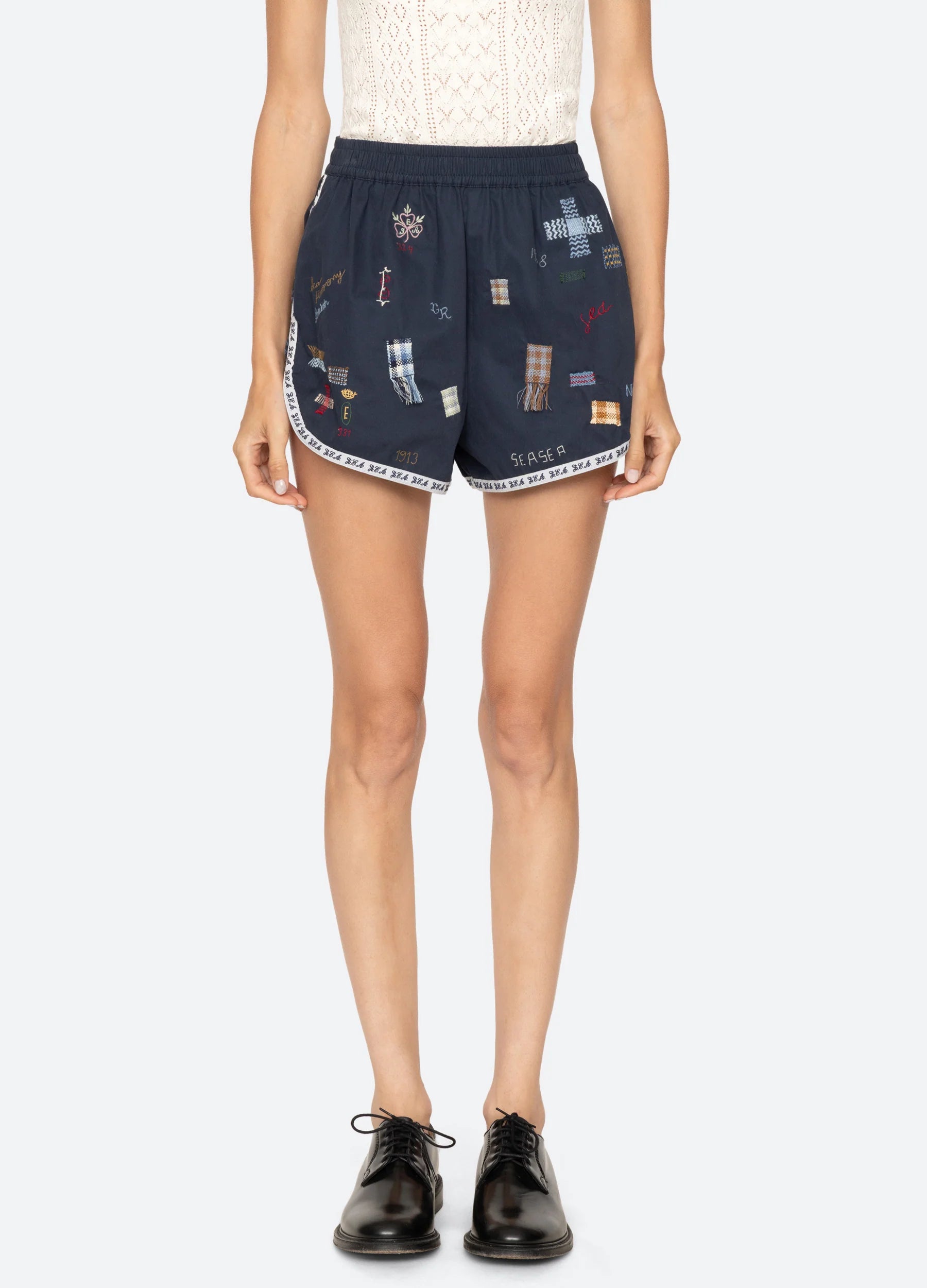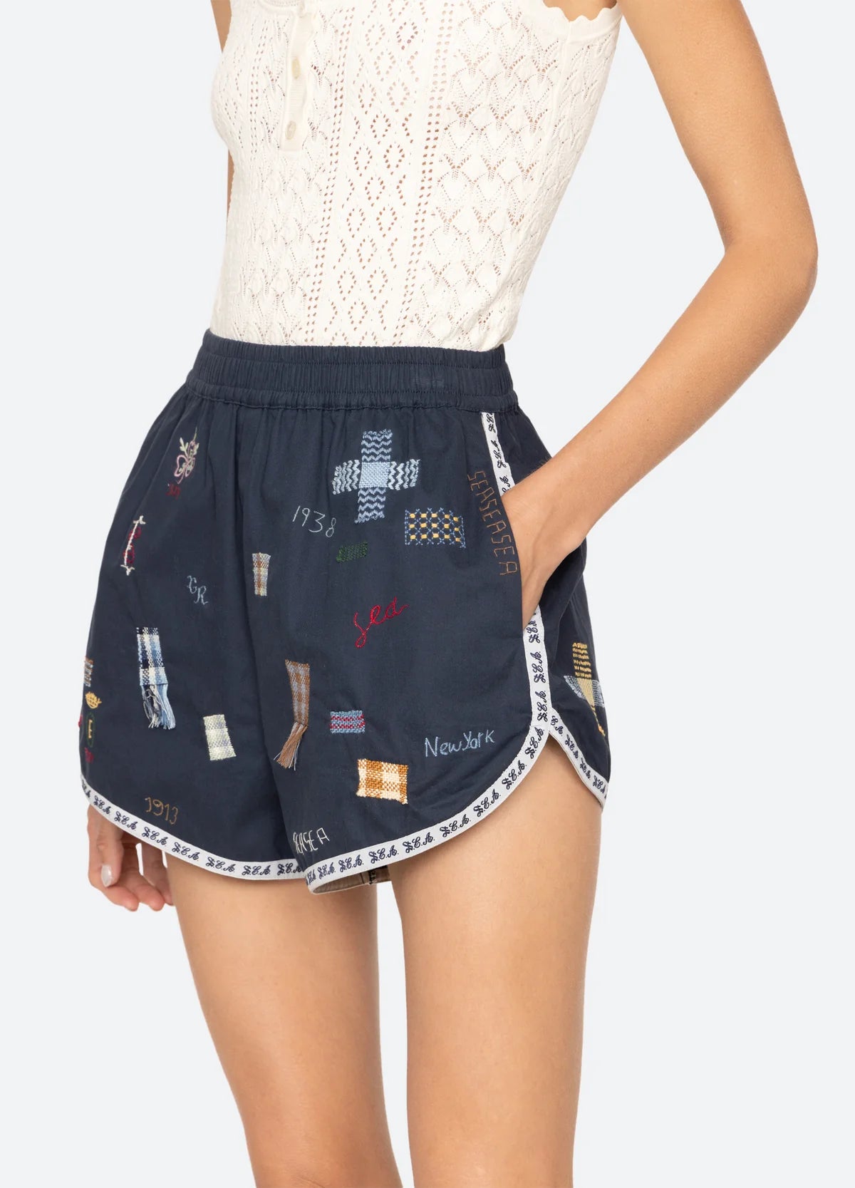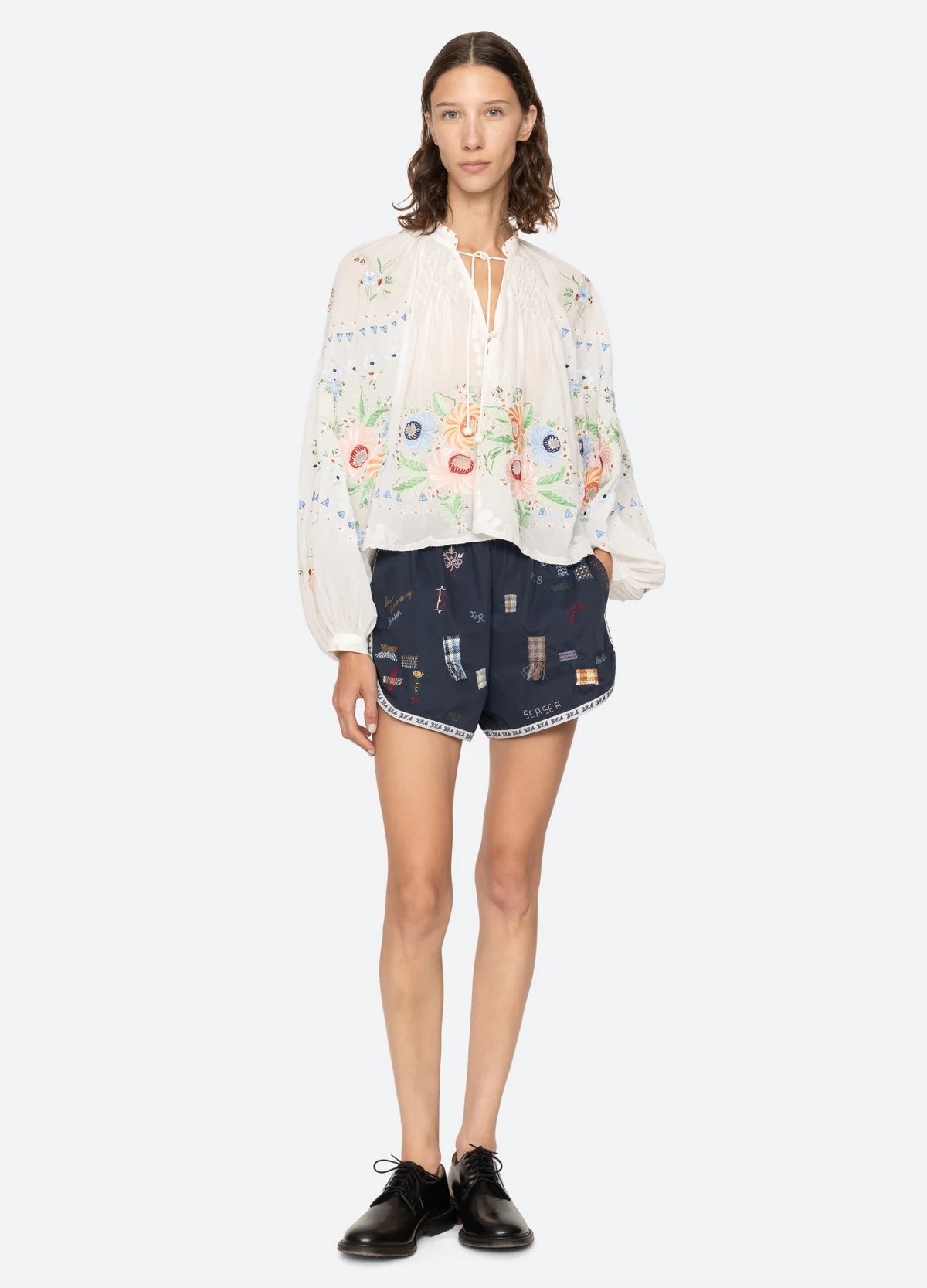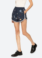 The Claira embroidered shorts are detailed with intricate embroidery and hand mended stitching throughout, accented with contrasting trim. Cut in a mini, track-short silhouette with an elastic waistband, they offer a sporty yet artisanal touch to everyday dressing.
