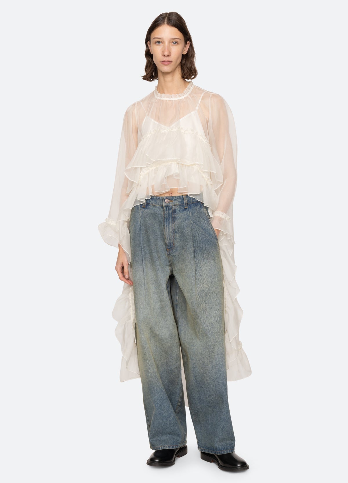 The Cornelia high-low top is crafted from airy sheer organza with ruffle detailing at the neckline and a tiered bodice. An exaggerated ruffled trim cascades along the hem, creating soft, dramatic movement.