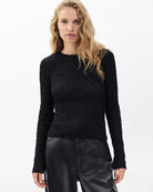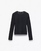 More than meets the eye. This long-sleeve top is a simple silhouette with a delicate edge. Crafted from two layers of soft, stretchy lace, it's cut for a slim fit and pairs just as easily with denim as it does with leather or suiting styles.
