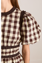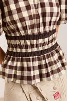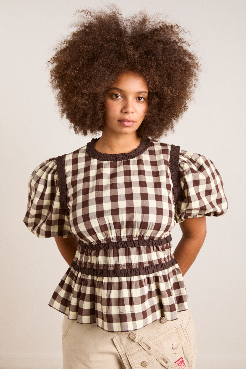 The Everly Ruffle Blouse in Butter Gingham is designed to bring soft structure and playful charm to your wardrobe. Crafted from 100% organic cotton, it features removable puff sleeves secured with discreet button fastenings, giving you styling versatility from day to night. Frill detailing at the neck, arms, and waist adds romantic texture, while a peplum hem creates a flattering, sculpted silhouette.