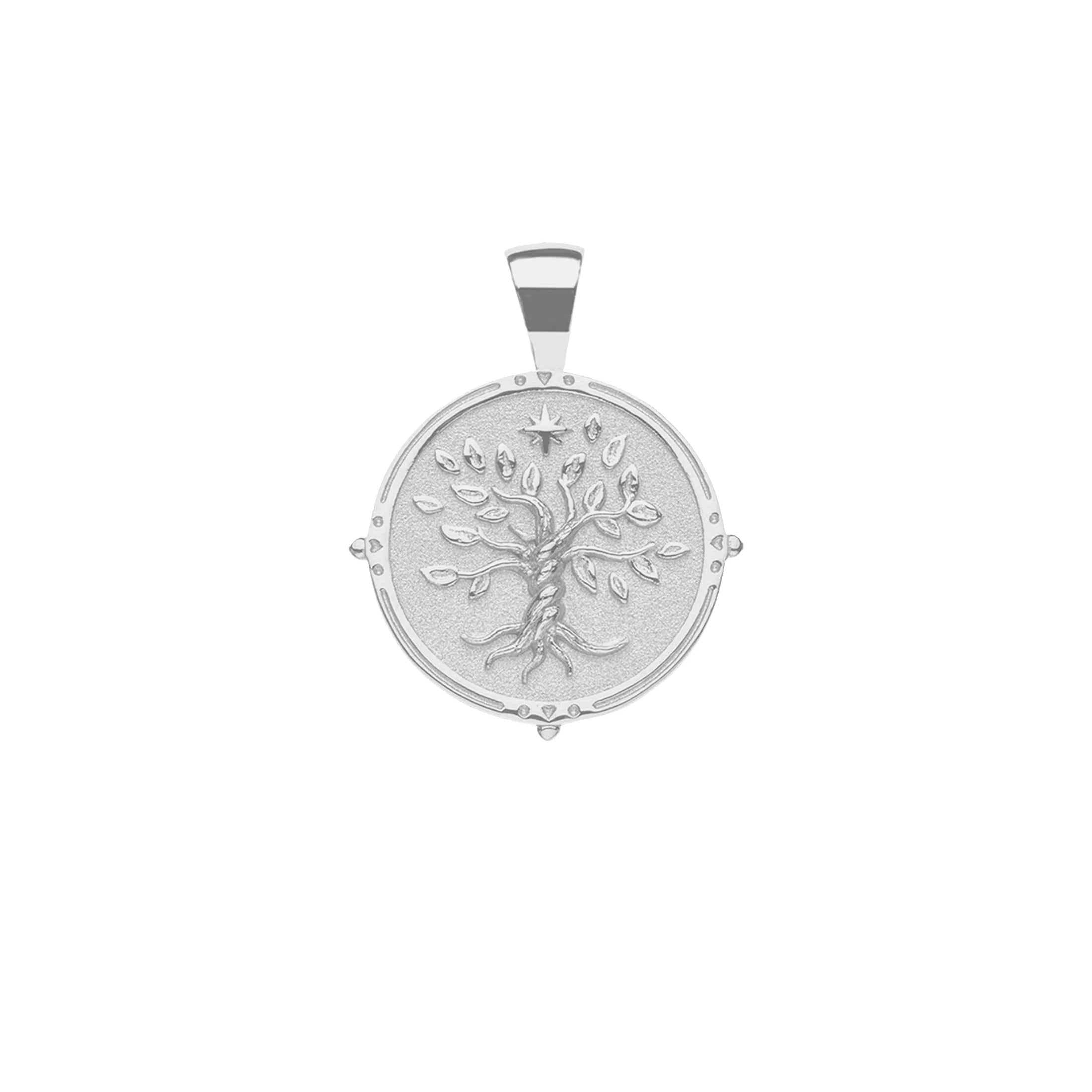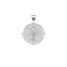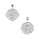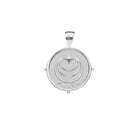 Coin pendant made of sterling silver dipped in rhodium, measuring 1" in diameter.