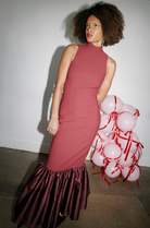 FITTED MAXI DRESS ZINFANDEL IS A SLEEVELESS, HIGH-NECK MAXI DRESS IN A BODY-HUGGING SILHOUETTE. DESIGNED WITH A WIDE, VOLUMINOUS HEM IN A SHINY FABRIC THAT CREATES A DRAMATIC FLARED FINISH AT THE BOTTOM. CLOSES AT THE BACK. COMPOSITION 1: 95% POLYESTER (RECYCLED) 5% ELASTANE