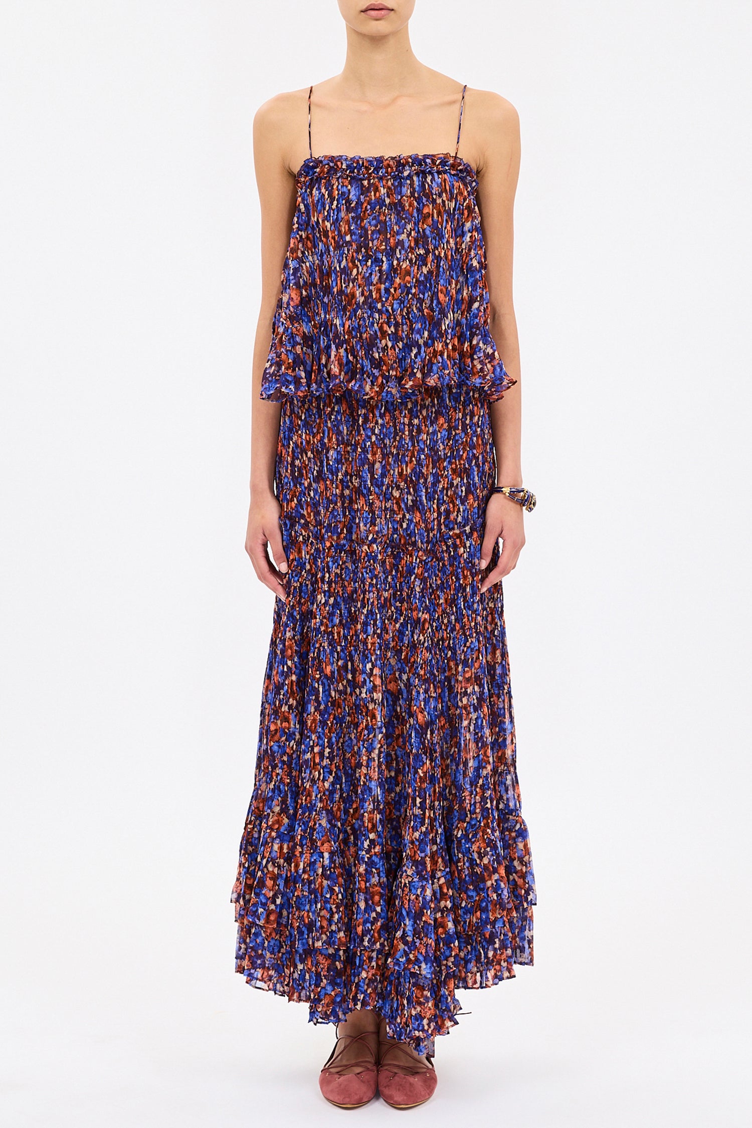 Easy and considered, the Florian Top is cut from silk chiffon with a crinkled effect, awash in delicate botanicals inspired by pointillism artwork. This multicolored, cropped silhouette easily styles with denim, while the gathered tiers and ruffles imbue the hem with delicate movement.
