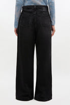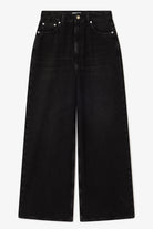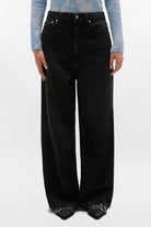 These jeans in black washed denim feature a zip and button closure, 5 pockets, belt loops and a GANNI logo at the back pocket.