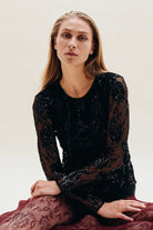The Jenine Blouse makes your outfit shine with its flower sequin detailing. The mesh blouse has a sheer and fitted look with gatherings at the sides. It has an extra mesh layer at the body for some extra coverage.