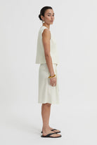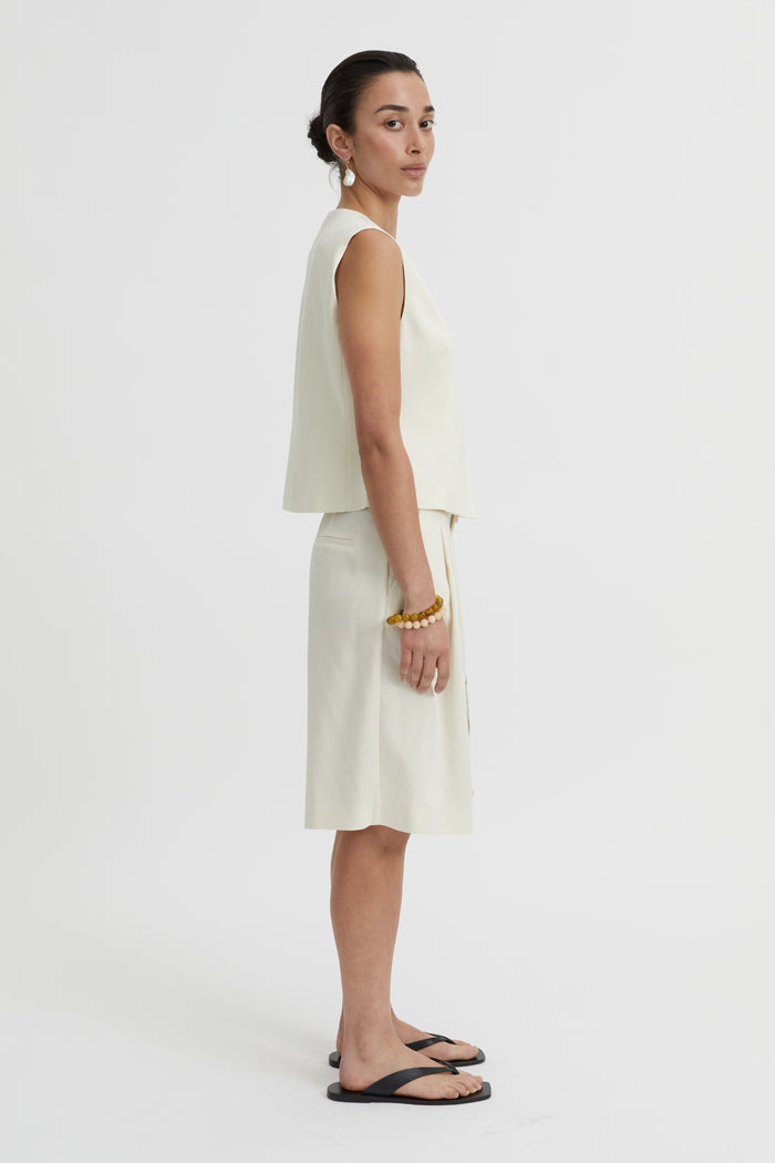 The Junia Vest in Ivory reimagines tailoring through a lens of quiet confidence. Defined by its clean, asymmetrical crossover front and statement button detailing, it offers a sculptural yet understated silhouette. The sleeveless cut and cropped length bring modern ease, making it a versatile piece for both structured and relaxed styling.