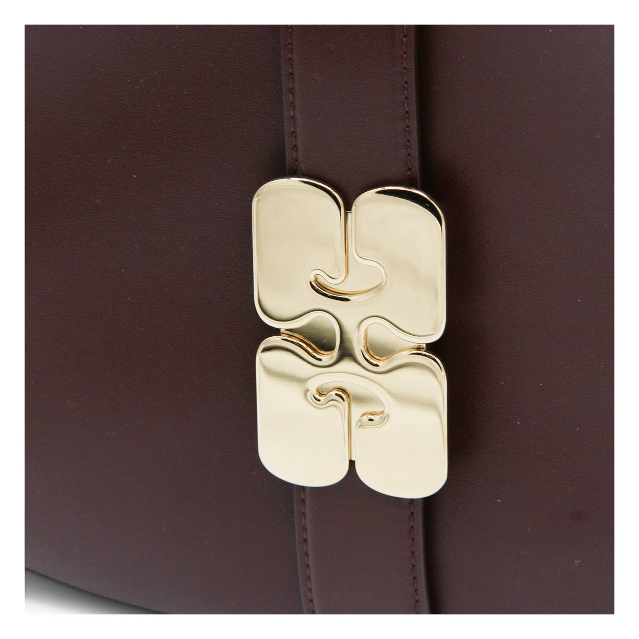 This bag features a soufflet-style silhouette, a shoulder strap and D-ring detailing at the side. The bag has a closure tab with the signature GANNI Butterfly clasp in gold-tone, 1 main compartment and an inside open pocket.