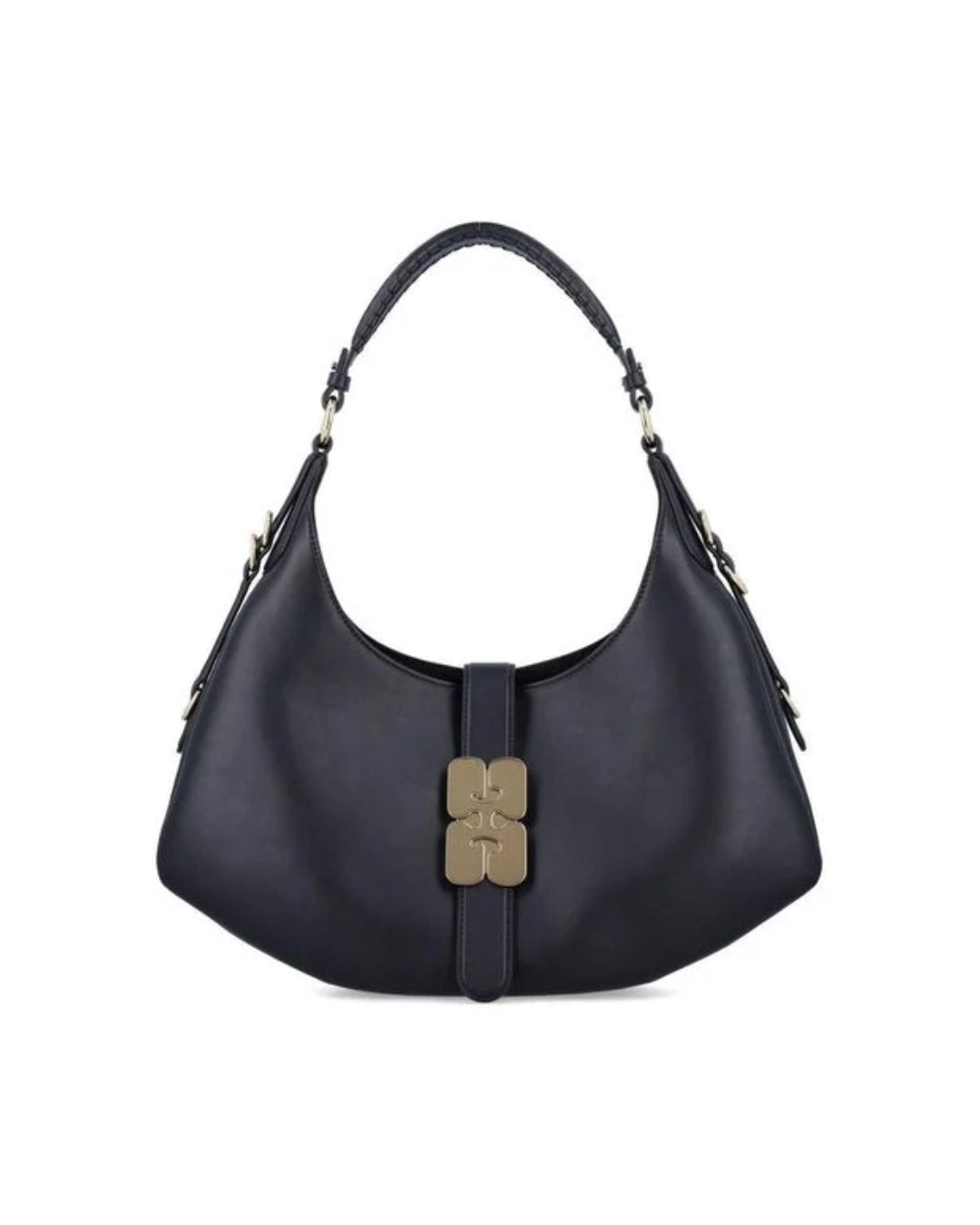 This bag features a soufflet-style silhouette, a shoulder strap and D-ring detailing at the side. The bag has a closure tab with the signature GANNI Butterfly clasp in gold-tone, 1 main compartment and an inside open pocket.