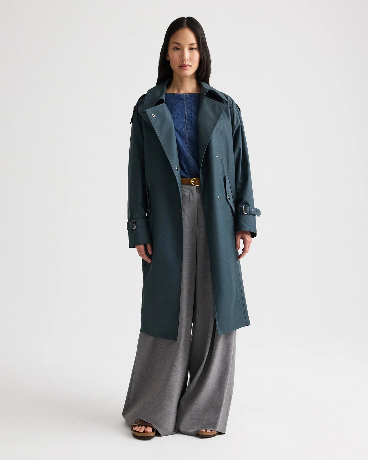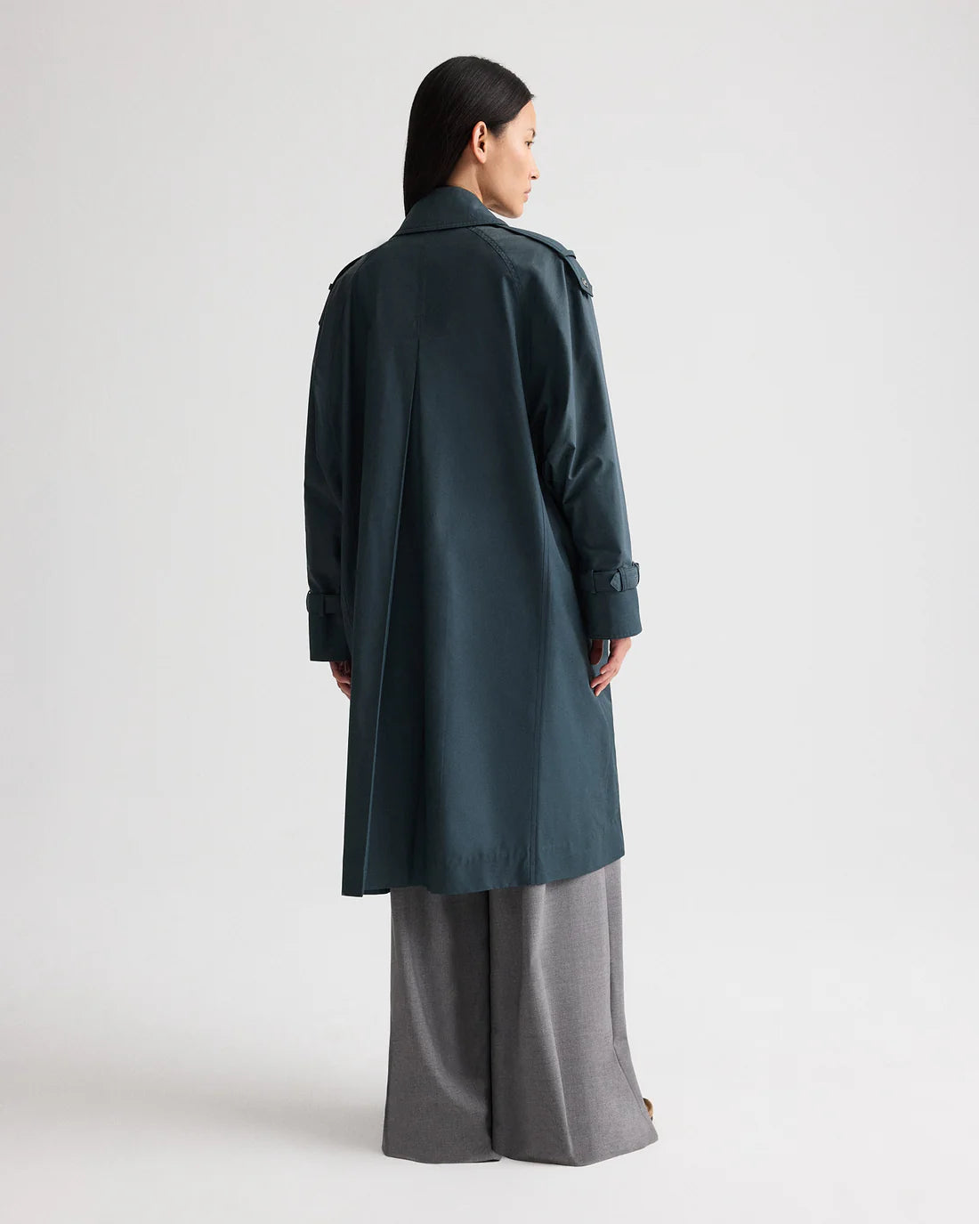 Long trench-style coat in water-repellent twill. Crafted from durable cotton–nylon gabardine with stain-resistant, water-repellent finish. The Long Bogie is designed with a structured stand collar, asymmetrical button-front closure, and articulated paneling for clean lines. Finished with shoulder epaulettes, adjustable cuff straps, angled welt pockets, and a center back vent for ease of movement.