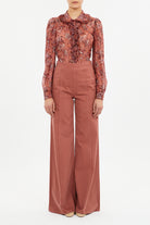 The Nina Blouse is adorned with palm florals and flickering dots atop a lightweight chiffon. This multicolored top is artfully puffed at the shoulders and finished with a burst of cascading, pleated ruffles.
