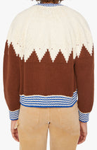 Take a hike. A raglan cardigan sweater with a crewneck and cropped hem. Made from 100% cotton, Head For The Hills is half cream, half brown with a zig-zag pattern and blue-and-white-striped hems.