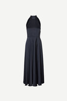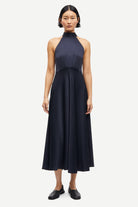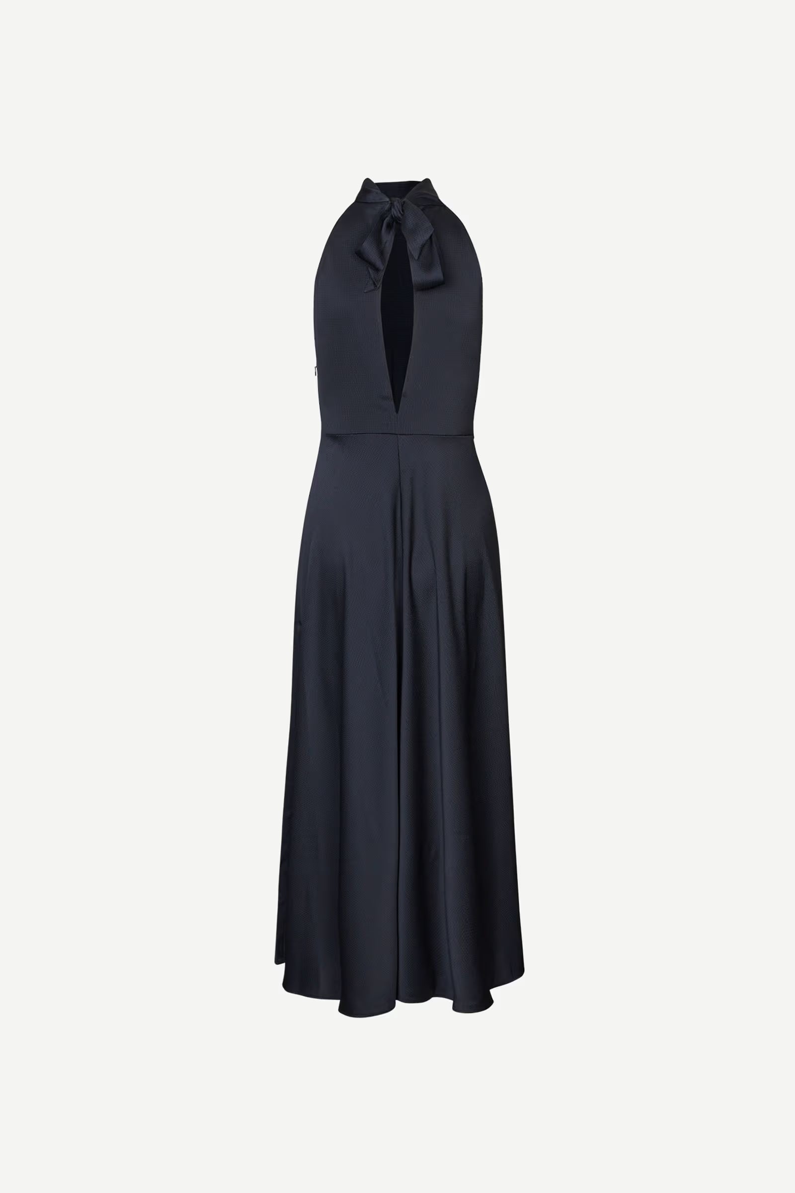 Sleeveless satin midi dress with a regular fit and flared skirt. Self-tie closure at the back and zipper closure on the side. Back split opening. Main material made from an elastic blend with recycled polyester.