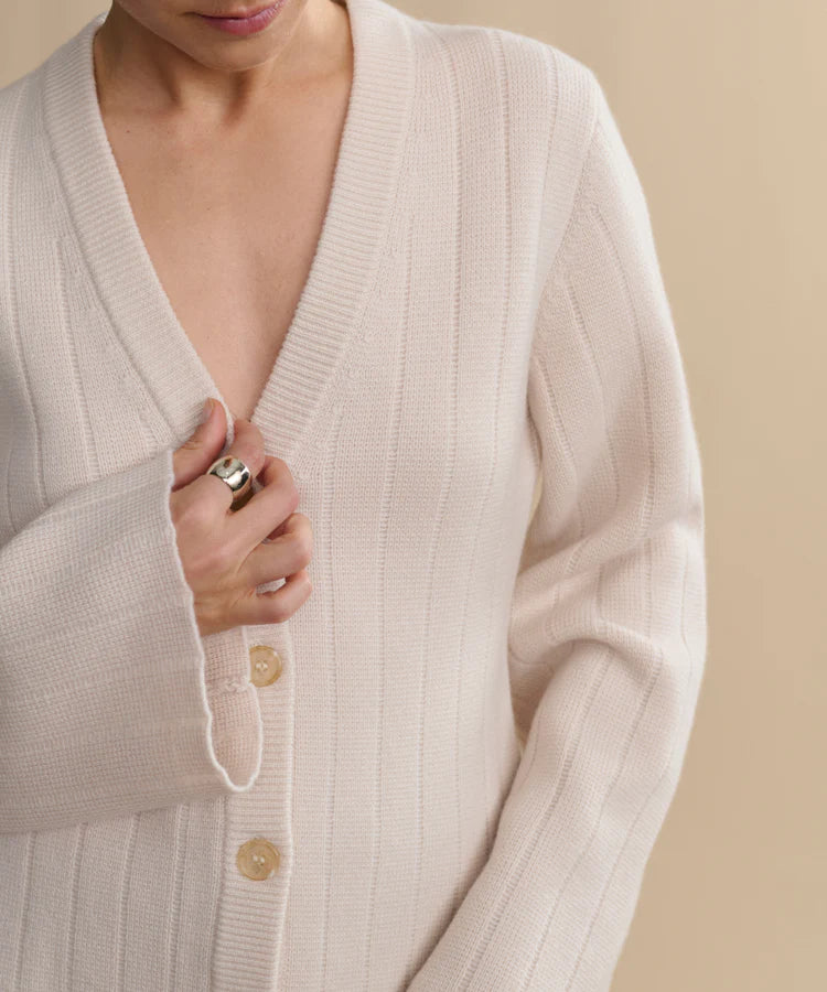 Featuring a nipped waist, straight arms, and a flattering V-neck, the Rory Cardigan is a refined knit with simple detail and all-season appeal. A drop-needle stitch brings subtle texture and dimension to a classic silhouette. With a versatile feel, it can be worn as a sweater or styled open as a light jacket—whatever the moment calls for.