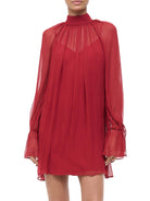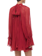 The perfect party mini dress, this style is made from a crinkle chiffon fabric and features a high neck with bow-tie detail at the back. Poet sleeves and shirring at the neckline create volume and drama with movement, with a removable under slip for added versatility.