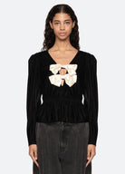 The Seraphine velvet top features voluminous puff sleeves, a v-neckline, and a gently flared peplum hem. The contrast satin bows add a subtle, feminine touch to its vintage-inspired silhouette.