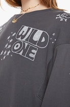 For the thrill of it. An oversized sweatshirt with a crewneck, drop shoulders, inset balloon sleeves and a relaxed fit. Made of 100% cotton in faded black, The Drop Square Inset in Wild Ones features faded white text graphics, hand-drawn doodles and studs throughout.