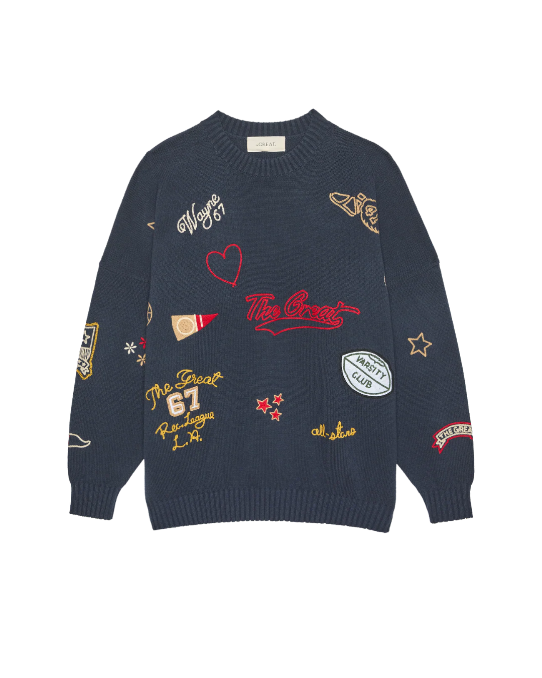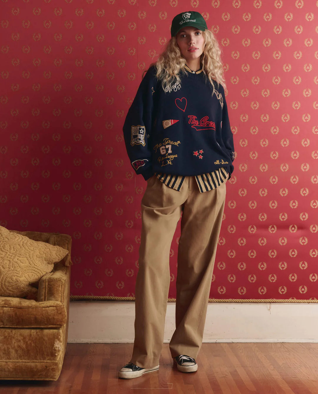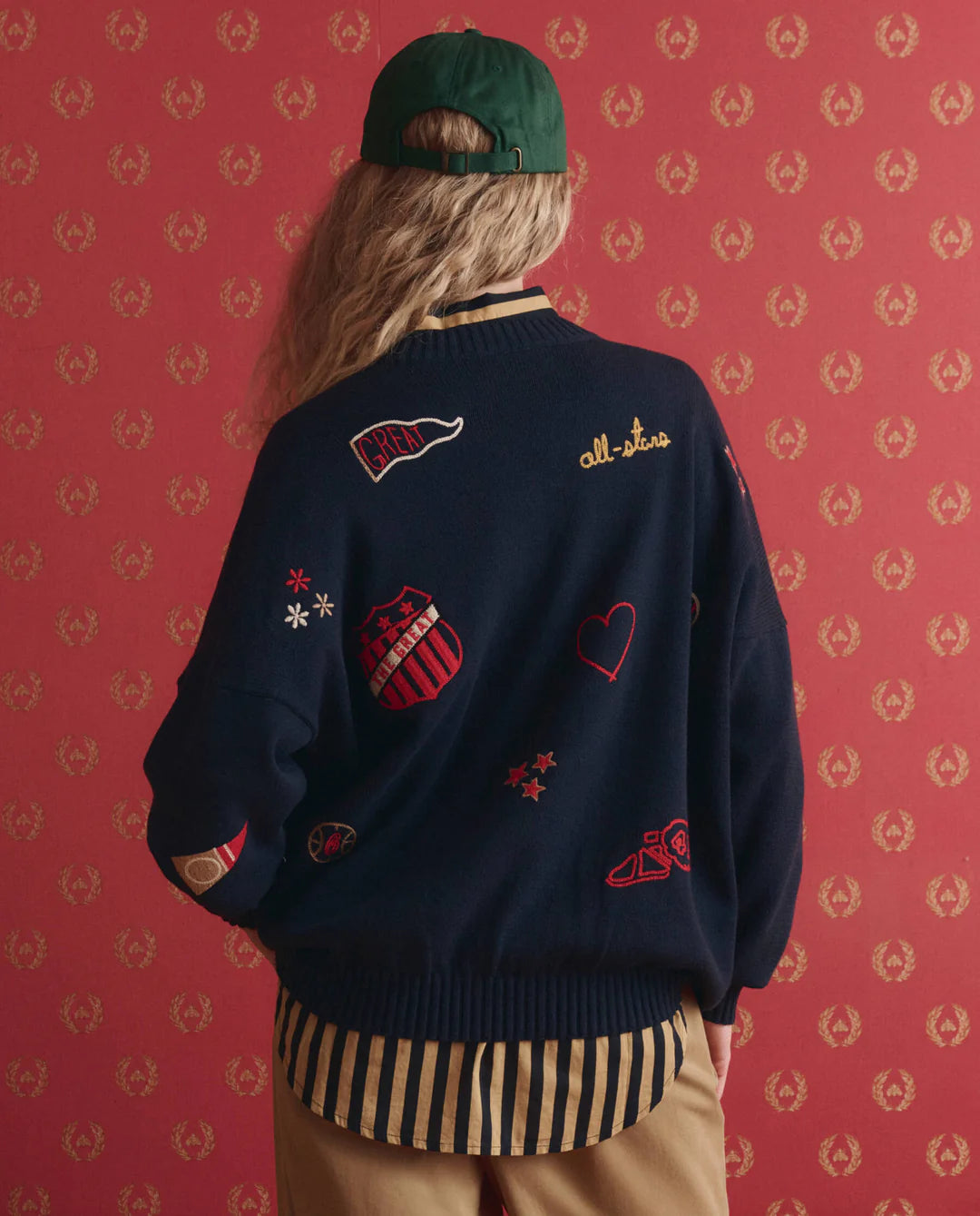 The Embroidered Oversized Crew Pullover draws inspiration from vintage varsity jackets of the 1950s, reimagined as a soft layer for spring. Designed with an oversized, relaxed fit, it features a classic crew neckline and ribbed finishes at the collar, cuffs, and hem for a timeless feel. The yarn is spun from a soft cotton blend that offers comfort and ease, while vintage-inspired collegiate medallions, school flags, and brand-memorabilia embroidery lend a playful sense of nostalgia.