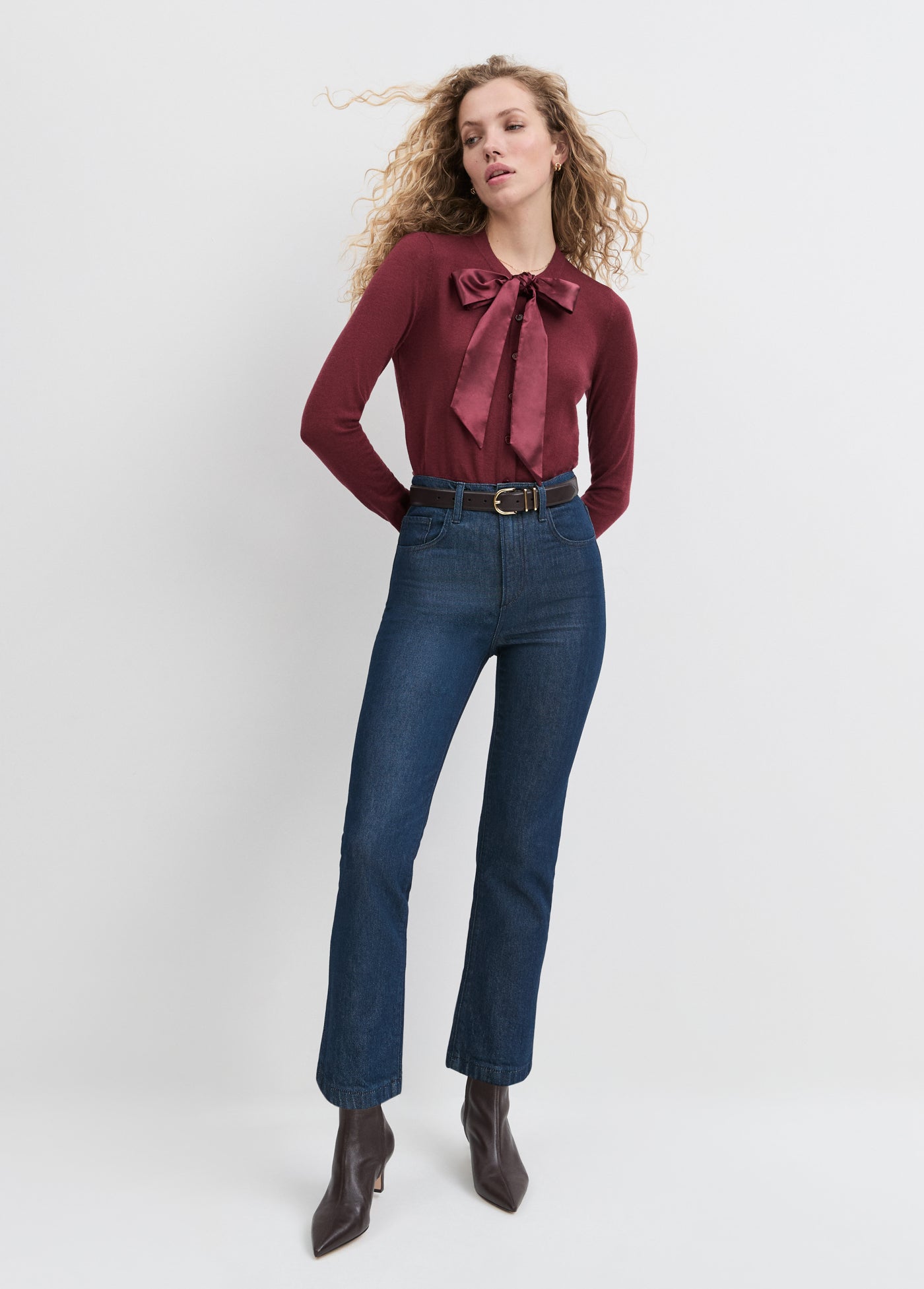 The Take A Bow Cardigan earns its applause. Our slim-fit cardi, cut from soft merino wool, is finished with satin buttons and a detachable satin bow that can be tied through the top button hole. Proof that classics can still steal the show.