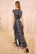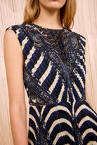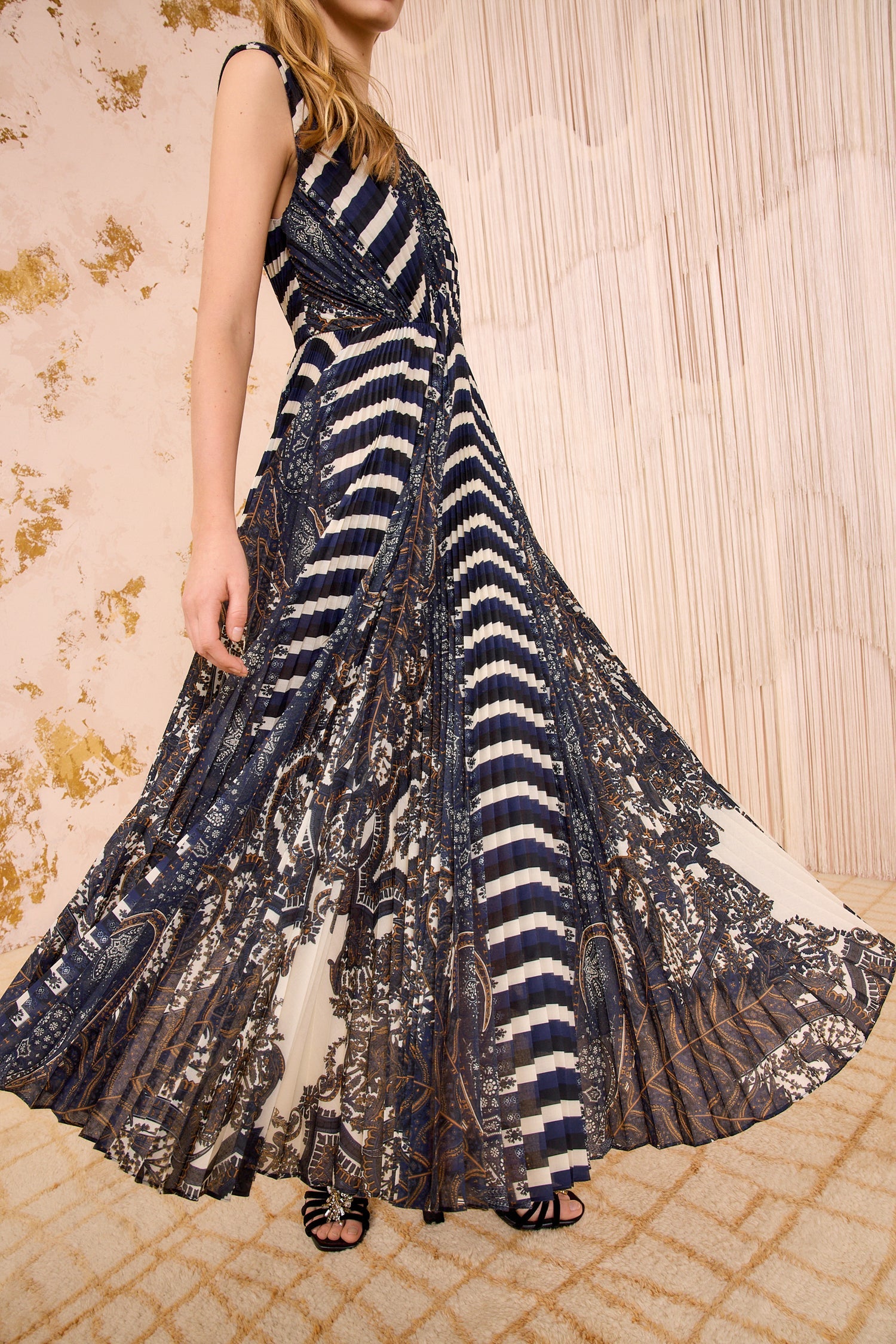 The Violeta Dress is rich in visual dialogue, with feather paisley motifs patchworked with bold stripes developed exclusively by our print designer. This multicolored silhouette is meticulously crafted with accordion pleating, imbuing the flared hemline with poetic movement.