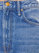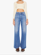 Wide leg jeans from SNACKS!, a collection of unconstrained silhouettes leaning into exaggerated shapes and extreme proportions. Experimental and non-era specific. For everyone, or not. Designed to sit on the hips with a slouchy fit, these super high-waisted jeans have a loose wide leg with a curved outer seam and a long 32-inch inseam with a clean hem. Made from a rigid recycled cotton blend, Rolling In The Dough is a mid-blue with a pretzel-detailed button and candy-inspired interior rivets. Would you like a treat?