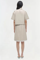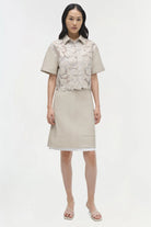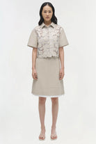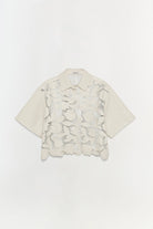 The Robinson Embroidered Shirt in Sand Multi. Featuring vegan leather abstract floral embroidery, this camp shirt combines artistic detailing with a modern silhouette.