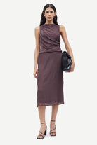 Midi skirt with a slim fit. Invisible zipper closure on the side. Mid waist. Fully lined. Main material made from 100% recycled polyester. This product is GRS certified. Each stage of the supply chain has met strict social, environmental, and chemical requirements.