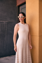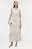 The Zelma Knit Maxi Dress in Sand Multi. This striking maxi, crafted from gingham knitwear, blends bold patterning with a streamlined silhouette for a refined yet dynamic aesthetic.