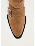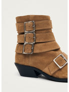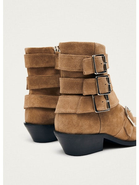 Suede tan leather ankle boots adorned with buckles Not sure if you feel more like a rider or a cowboy? Here’s the perfect compromise. Crafted from suede tan leather, the Eras ankle boots are the little sister of the Ryder, featuring pointed toes, cowboy heels, and silver buckles typical of a rider boot.